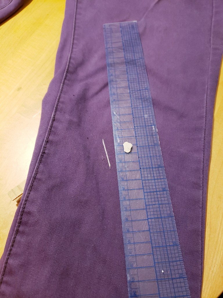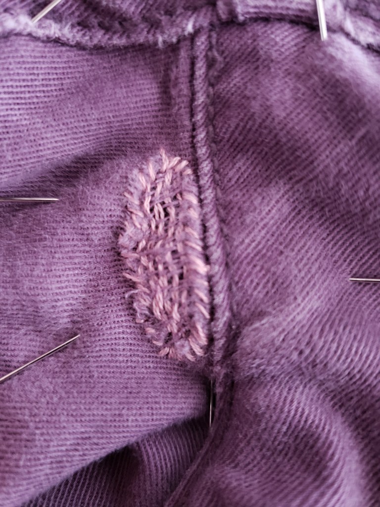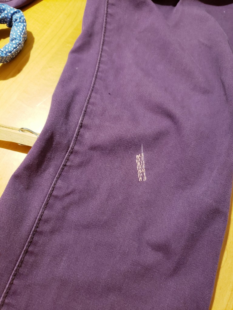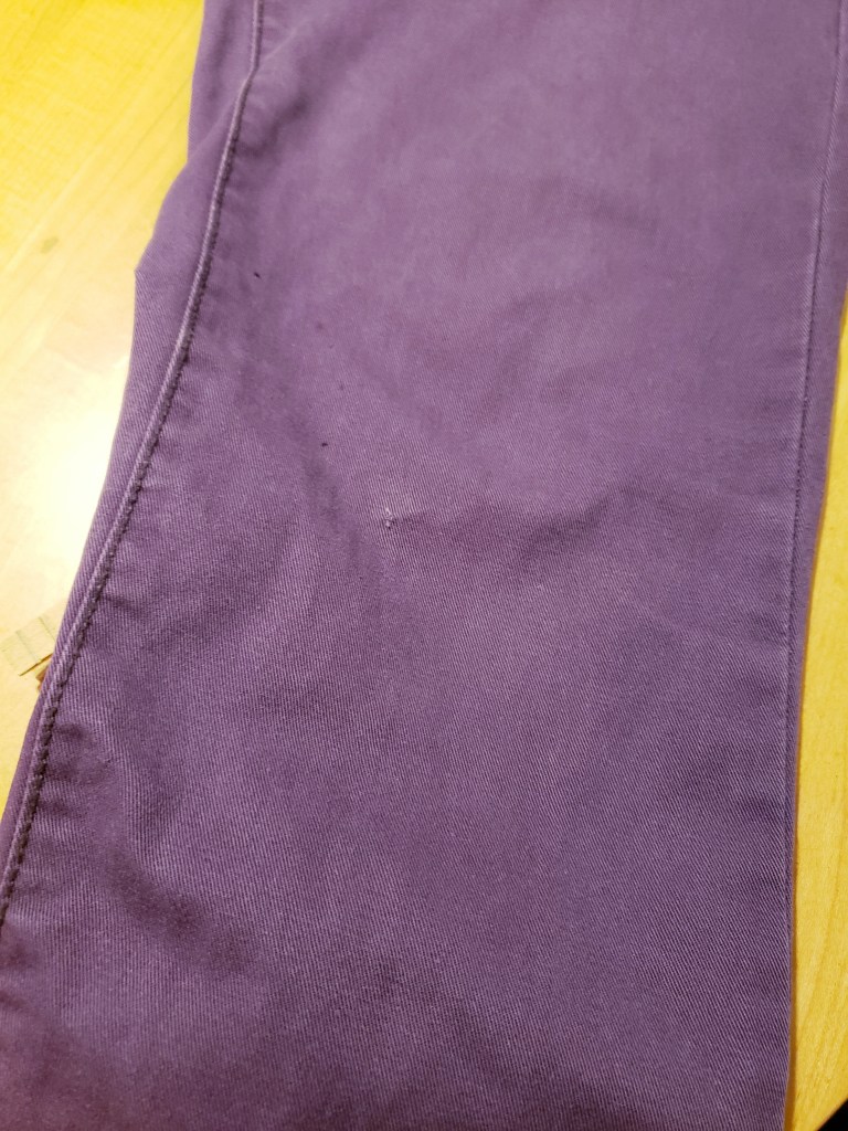 La réparation des deux petits trous est franchement rapide. C’est réglé en 30 minutes top chrono! Je vous mets au défi d’acheter une paire de pantalons mauves et de revenir à la maison en 30 minutes!!