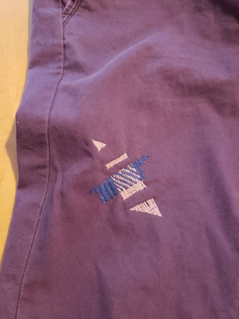Premier accident: une tache d’un produit javellisant bien en vue sur le haut de la cuisse droite. Le désemparement est total. Que faire donc avec cette tache? Le seul tissu que j’aurais pour couvrir la tache, je l’ai déjà utilisé pour rapiécer les coudes du cardigan qu’il met souvent avec lesdits pantalons. Pas question de réutiliser ce tissu et de créer ainsi un petit kit trop agencé. Je propose donc une technique dont j’ai entendu parler sur Instagram, le visible mending (raccommodage visible?). Après quelques recherches, je me lance un peu à tâtons et je brode un motif qui cache la fameuse tache. Le résultat est pas trop mal pour un premier essai, mais je ne suis pas satisfaite: points irréguliers, fil un peu croche… Le conjoint est content et ses collègues lui demandent quel designer a créé ces pantalons. « Un designer très local », leur répond-t-il…