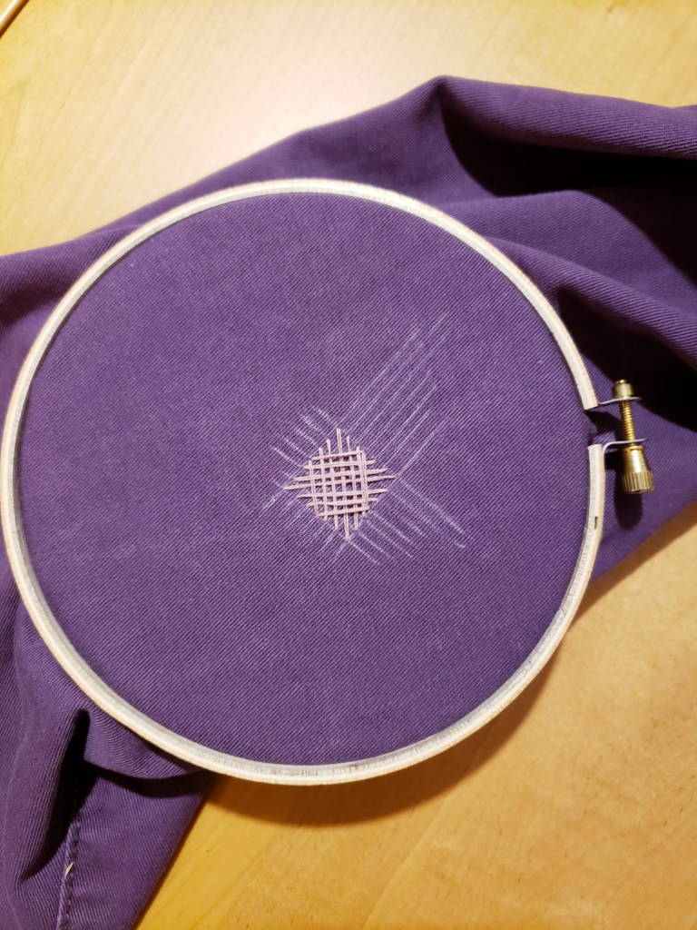 Je dois apprendre à broder droit, il semblerait. J’ai donc profité du deuxième petit trou à recouvrir pour entamer cette pratique. Le point parfait: point Norwich (un tutoriel ici). Pour m’aider, j’ai pris les grands moyens. Première étape, dessiner des guides à la craie. Deuxième étape, utiliser un cercle à broderie. Le look un peu plus intentionnel me plaît bien.