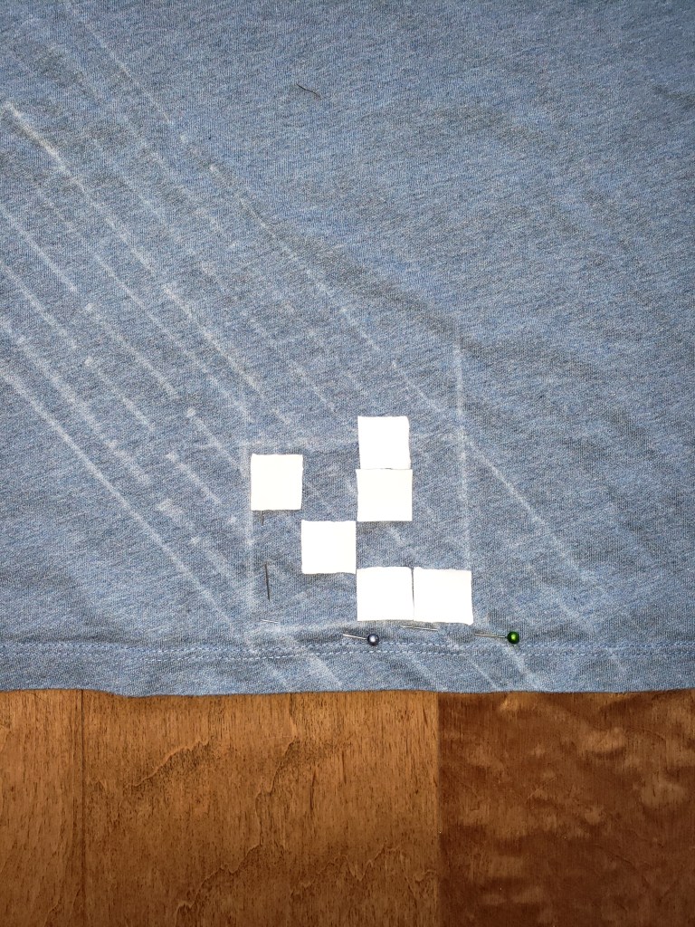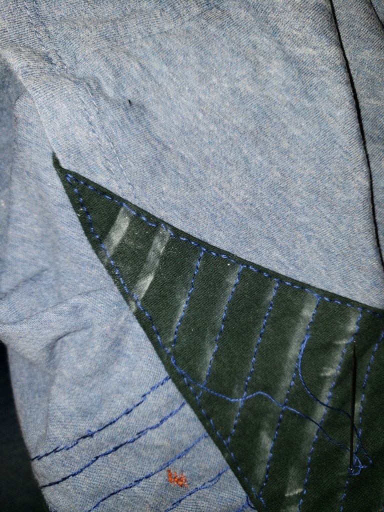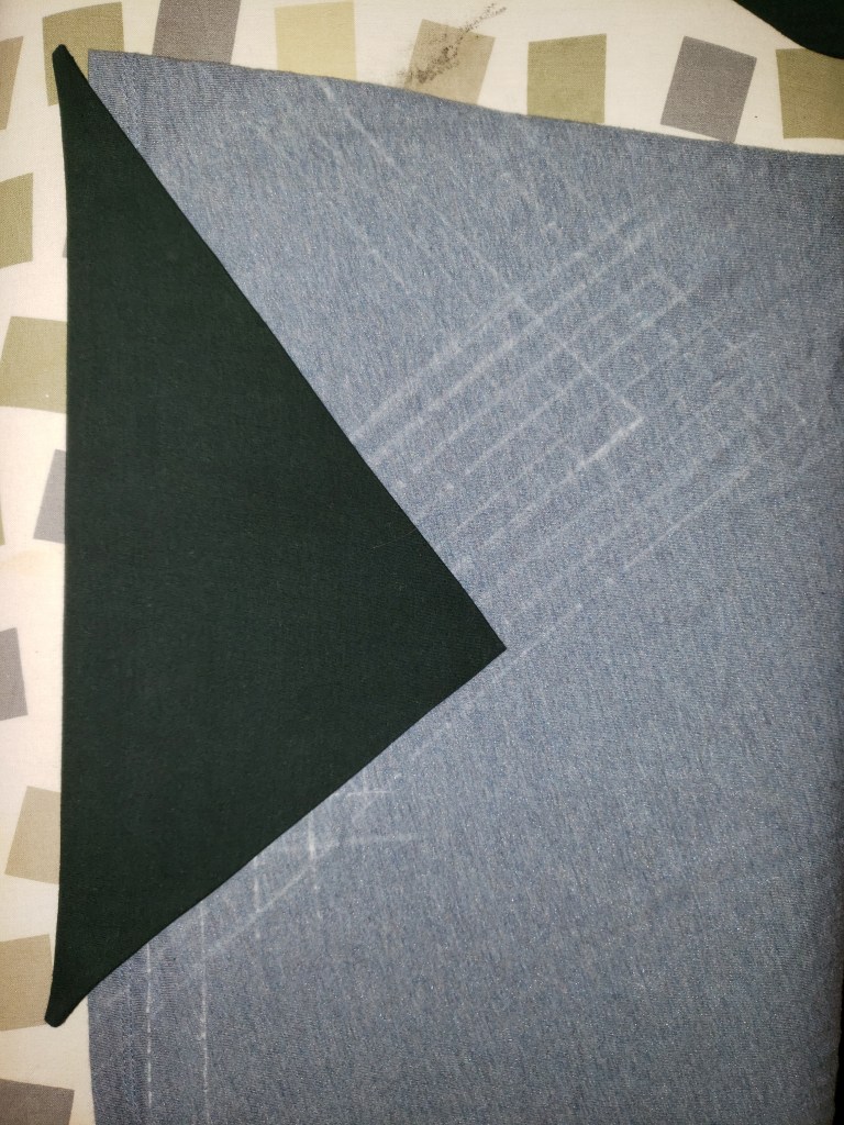 Suivant les traits de craie visible sur le chandail au départ, je souhaitais poser une grande patch triangulaire. Je le concède, l’un des désavantages de réutiliser d’ancien vêtements est qu’on n’a pas la liberté complète quand aux formes et aux tailles des pièces découpées. Dans ce cas-ci, je me suis contentée d’un triangle un peu plus petit que désiré initialement.