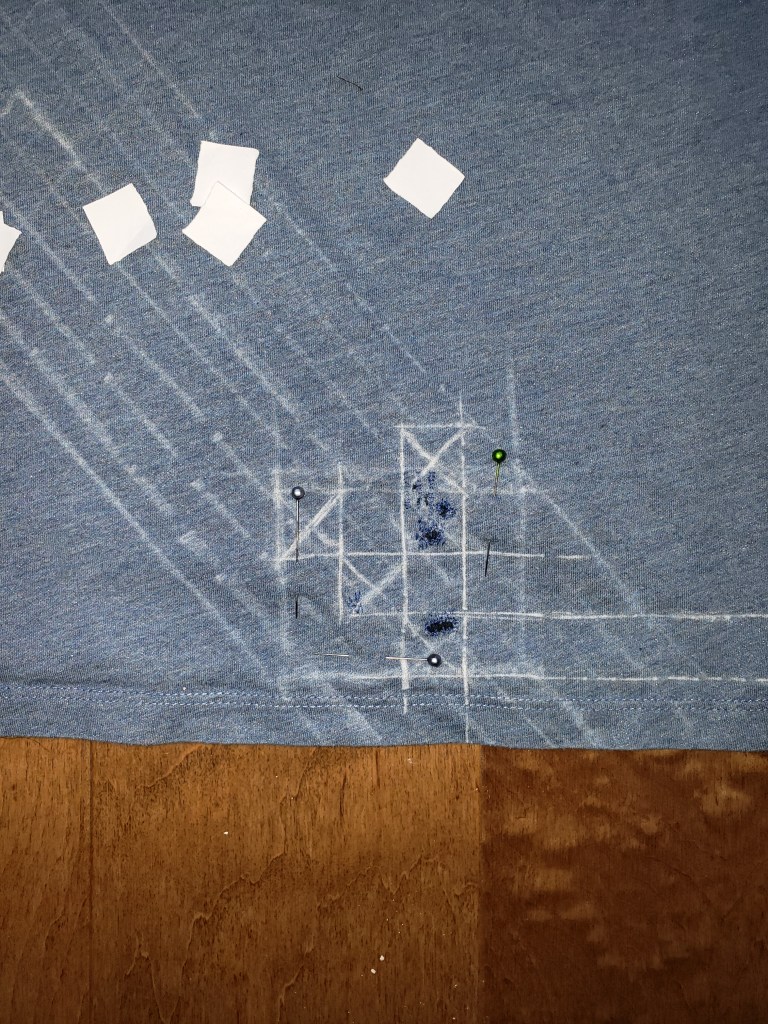 La première étape, même à la machine, est de replier les cotés avec un fer. J’ai plié environ 0,5 cm tout le tour. Deuxième étape, poser la patch. Ma machine étant fraîchement sortie de chez le réparateur, je n’ai pas osé lui faire subir le jersey. J’ai donc entrepris de poser la patch à la main. J’ai utilisé un point arrière pour toutes les coutures. J’ai commencé par faire le tour de la patch en cousant à quelques millimètres de l’ourlet. Comme on veut que la patch suive le vêtement, quelques coutures supplémentaires sont requises. J’ai décidé d’y aller avec des rayures espacées d’environ 1,5 cm. Comme je suis loin d’être experte en broderie, j’ai dessiné toutes les lignes à la craies pour avoir un guide.