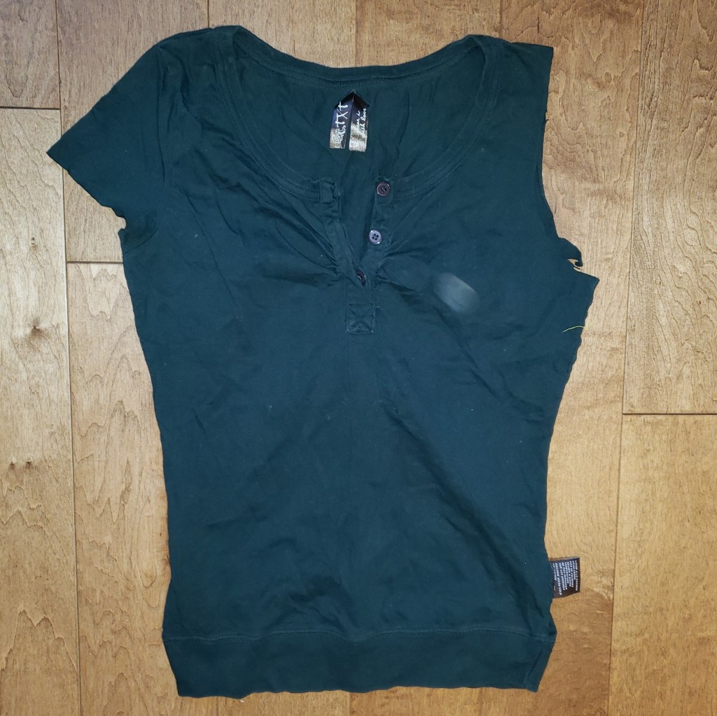 D’une part, on peut acheter un nouveau t-shirt pour ridiculement peu cher et donc pourquoi les réparer ? Oui certes on pourrait dire que « ça ne vaut pas la peine ». D’autre part c’est vraiment dommage pour le reste du tissu qui est en très bon état (et pour mon précieux que je devrai gaspiller à magasiner!)