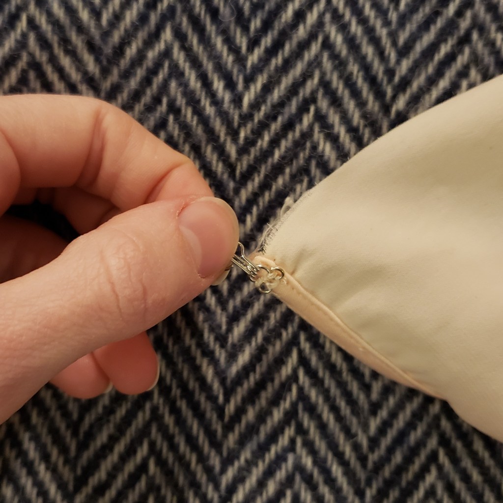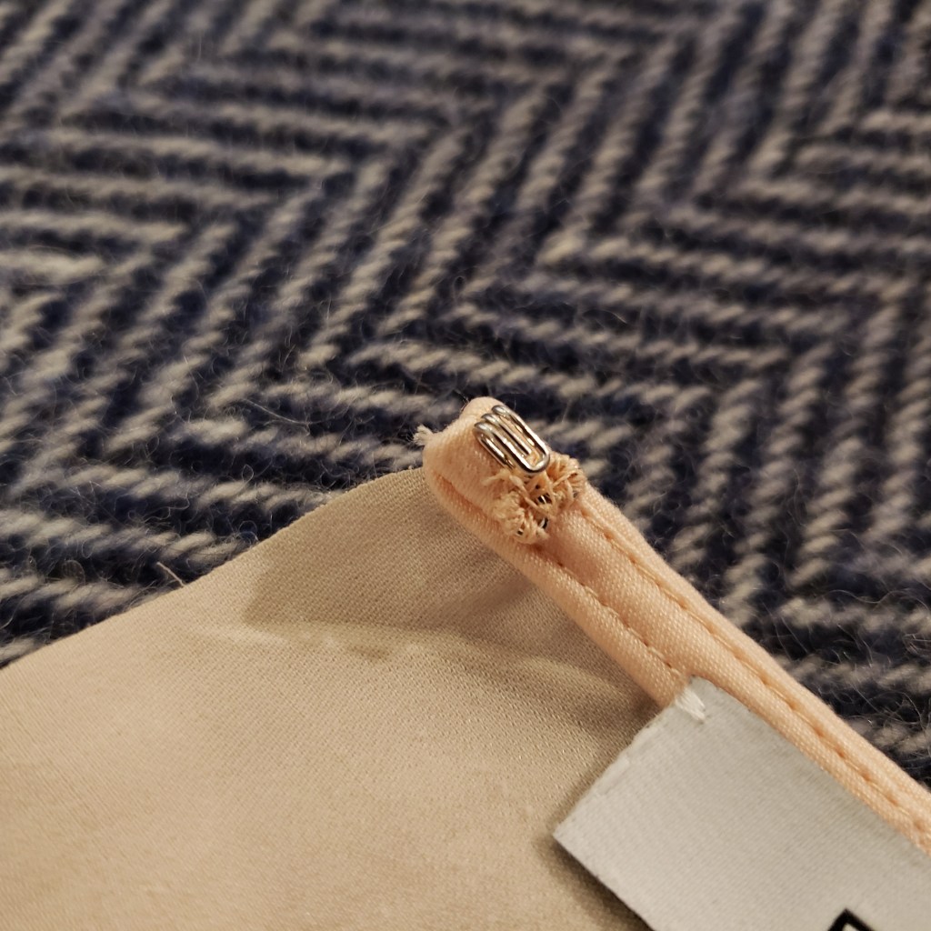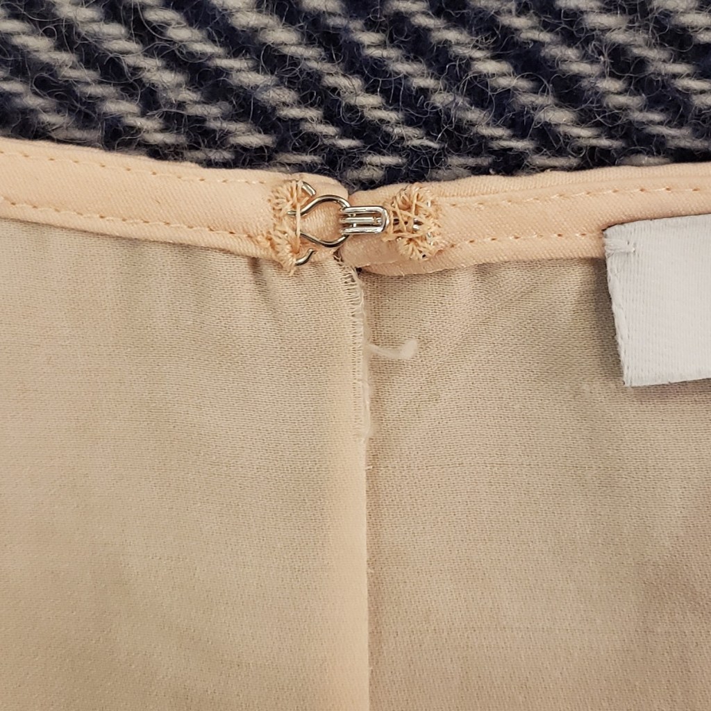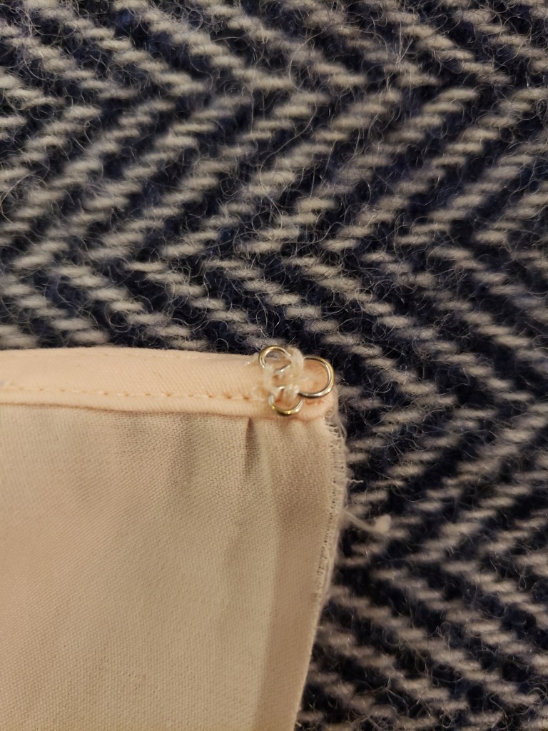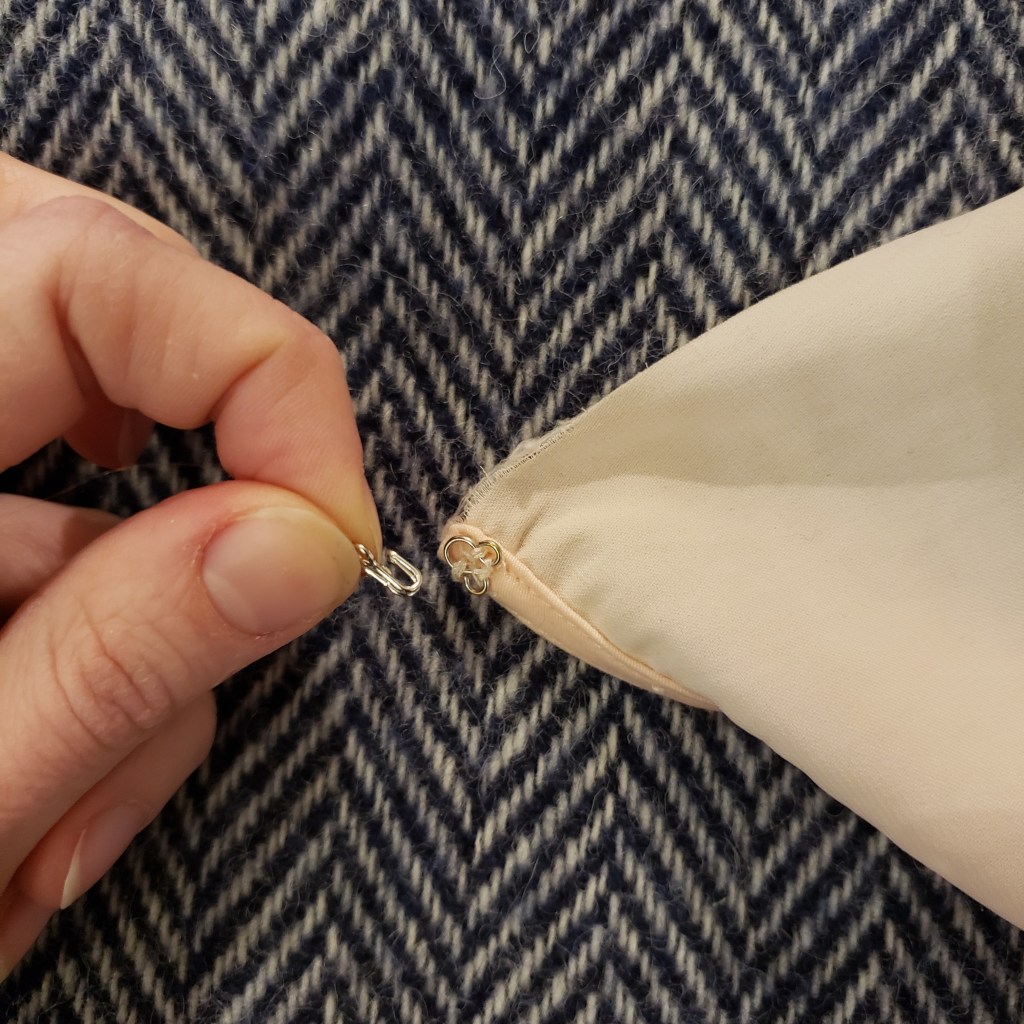 Si c’est votre première fois, je vous conseille cette petite vidéo. Dans tous les cas, la couture ne sera pas exactement comme sur le schéma ou comme dans la vidéo. Puisque le vêtement a été « fini » avec des outils que vous n’avez peut-être pas en main, il y aura plusieurs épaisseurs à certains endroits qui pourraient rendre le travail plus difficile. On ne cherche pas la perfection! Tant que notre couture est invisible de l’extérieur du vêtement et que l’agrafe et la porte tiennent, on aura rempli notre mission.