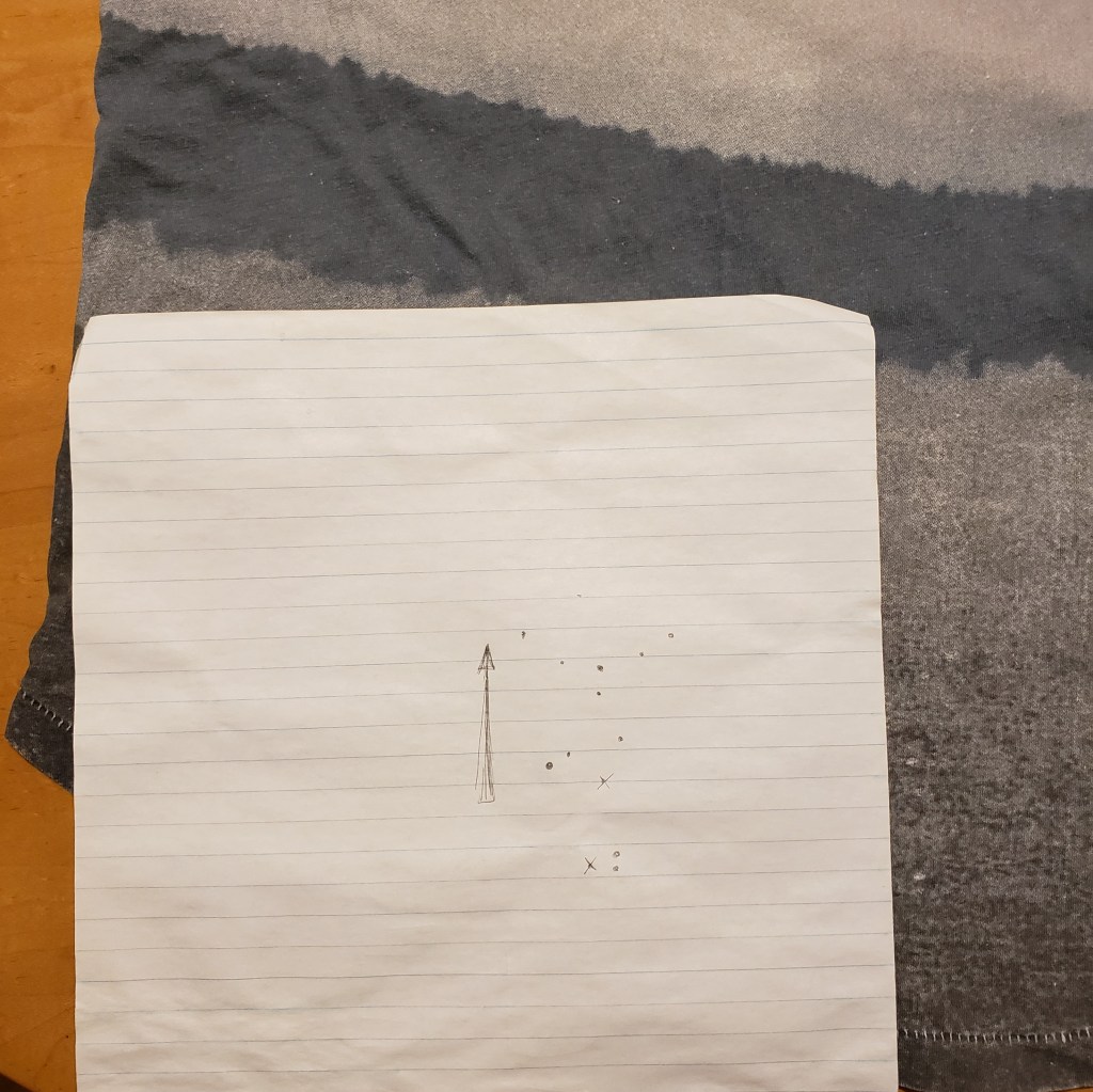 Première étape, dessiner les points. Les trous se rendent enfin utiles! J’ai glissé une feuille de papier dans le t-shirt que j’ai déposé sur une table avec des pesées pour le tenir bien en place. La pesée est simplement un objet lourd: verre à cognac, cendrier, roches, choisissez votre vice. Ensuite, avec un crayon à la mine (vaut mieux ne pas faire de taches sur le t-shirt), j’ai fait un petit point dans chaque trou. Voyez la belle constellation! Il est aussi utile de marquer le haut de la constellation au cas où votre choix final de motif aurait un sens.