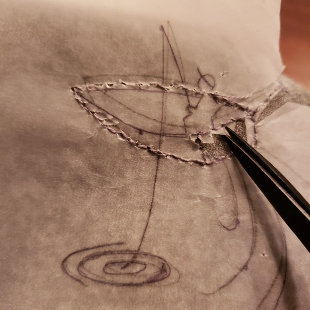 À l’épisode 1, j’ai couverts lesdits petits trous d’une grande patch. Pour l’épisode 2, je réessaie la broderie de façon plus informée.