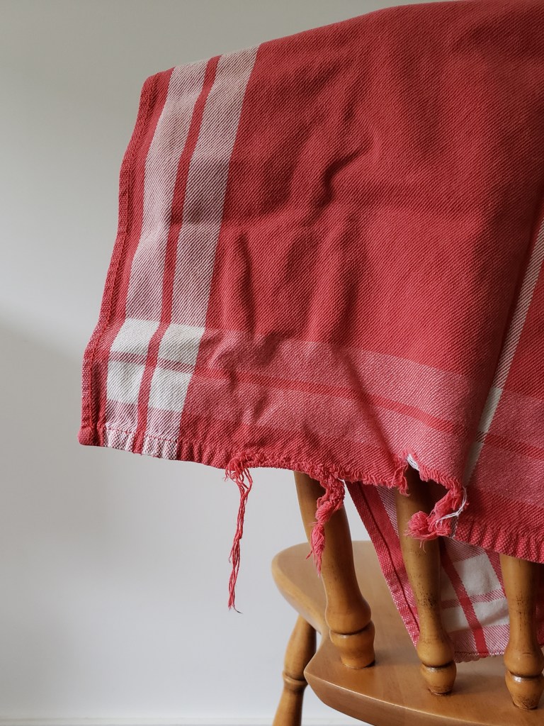 Voilà un exemple classique d’accident dans la cuisine: un tissu passé un peu trop près de la chaleur. C’est la triste histoire de ce linge de vaisselle! On pourrait dire que, c’est un simple linge de vaisselle. Mais je dirai: non! C’est un linge en coton épais qui essuie (vraiment) plutôt que d’étaler l’eau sur la vaisselle propre, ce qui le rend très précieux. En sa qualité de coton épais, il n’est pas donné non plus. Et le magasin qui les vendait est maintenant fermé. Je l’ai donc réparé rapido, presto.