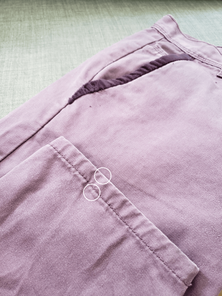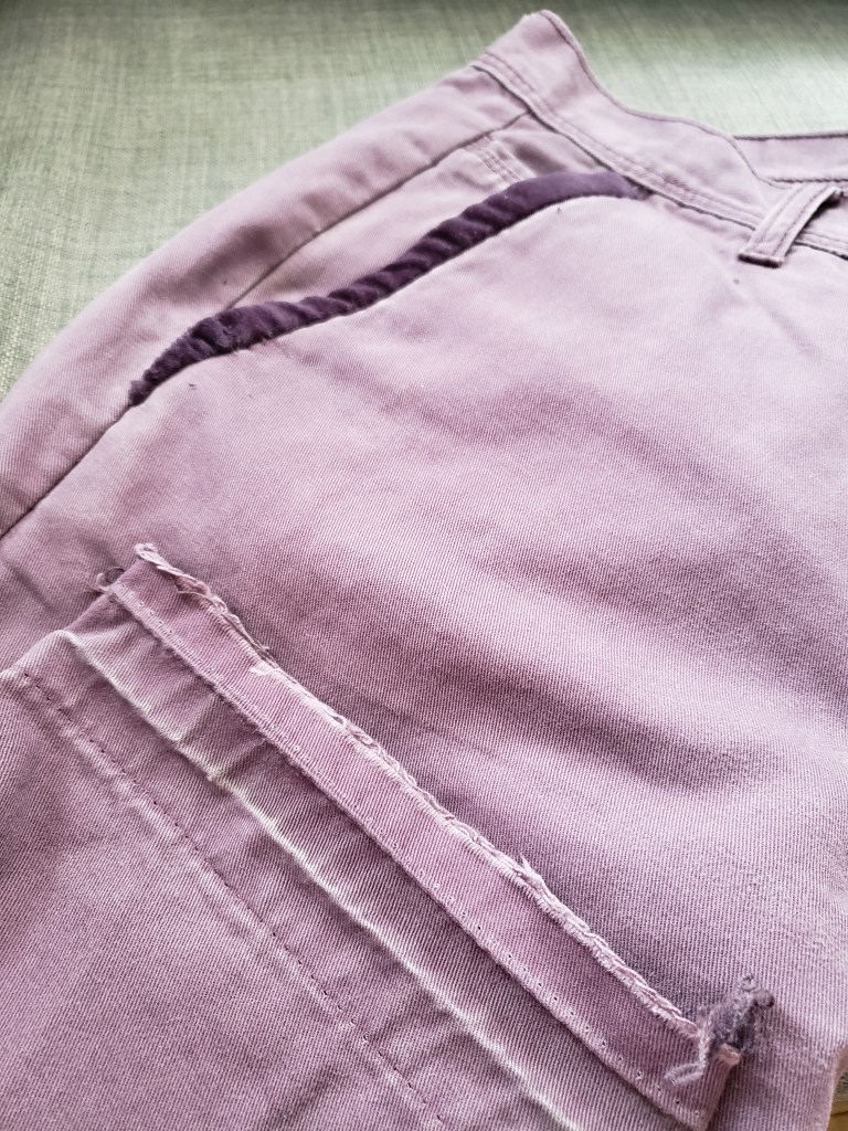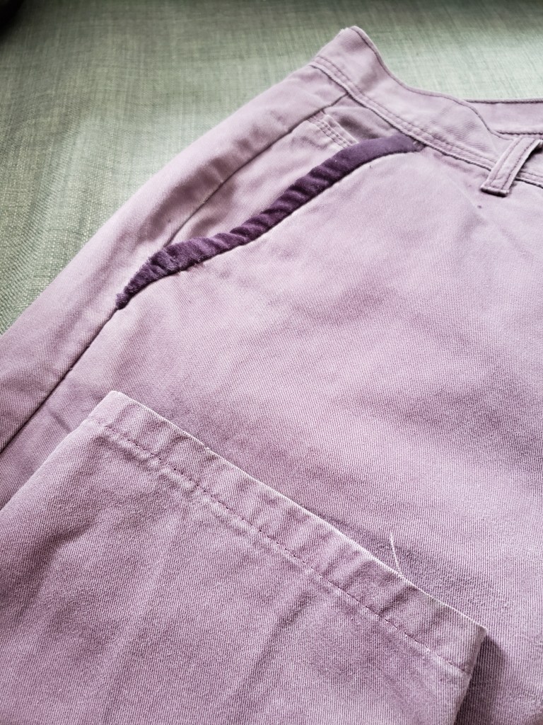 Les bien-aimés pantalons mauve de Monsieur font (déjà) leur retour sur le blogue. Après avoir réparé quelques trous, l’usure des poches et des bords du pantalon est devenue plus visible.
