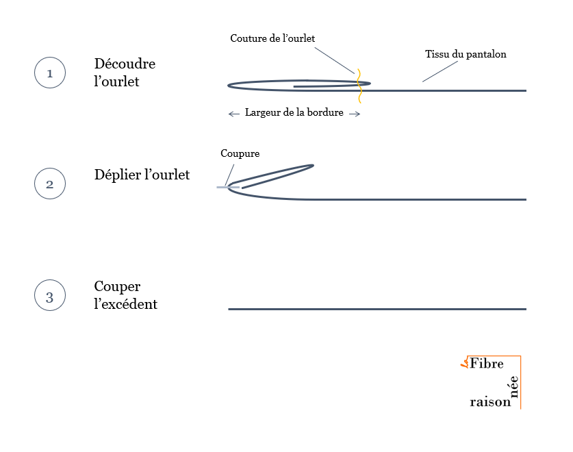 Pour éviter la lourdeur dans le bas du pantalon, mieux vaut découdre l’ourlet et retirer l’excédent de tissu. Il peut aussi être utile de mesure la largeur de l’ourlet pour calculer la taille du morceau de tissu à découper