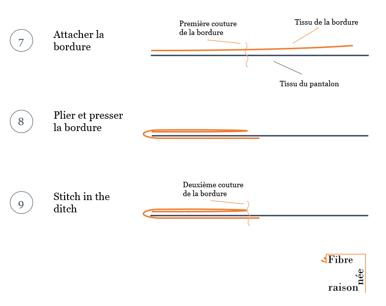 Finalement, on pose la bande sur le pantalon, en utilisant une technique similaire à celle utilisée pour les poches. On coud la bande endroit contre endroit sur le pantalon, on replie la bande puis on surpique dans la couture. Ça se fait très bien à la machine à coudre, si vous en avez une. Peu importe la méthode de couture, il ne faut pas oublier de repasser pour un résultat bien propre.
