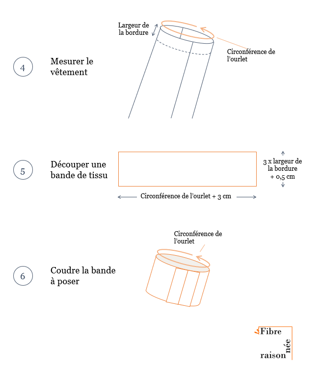 La prochaine étape est de préparer la bande de tissu qui sera posée sur le pantalon pour former la bordure. On découpe une bande dont la taille sera fonction du vêtement à réparer – voir les suggestions de mesure ci-dessous. Je conseille de faire un zigzag sur le contour pour éviter que le tissu ne se défasse. Les deux bouts de la bande sont ensuite cousus ensemble de façon à répliquer la forme de la jambe du pantalon.