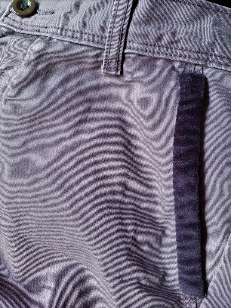 Le bas de pantalon offre un peu moins de flexibilité pour la largeur de la bande que la poche. La photo ci-dessous montre bien que le bas de pantalon a deux lignes d’usure, l’une à la pliure, et l’autre à la hauteur de la couture. On souhaite que la réparation masque les deux.