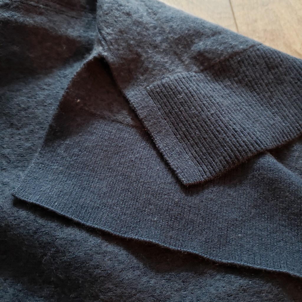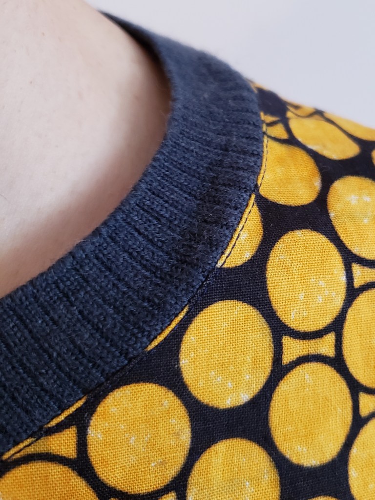 - Dans l’esprit de réutiliser ce que l’on possède déjà, j’ai utilisé la bande côtelée d’un chandail en laine (rendu très très très petit par les lavages en machine) pour le col. Pour ce faire, j’ai suivi les instructions comme si j’avais acheté une bordure côtelée commerciale. Attention, il en faut minimum 3,5 cm de large.