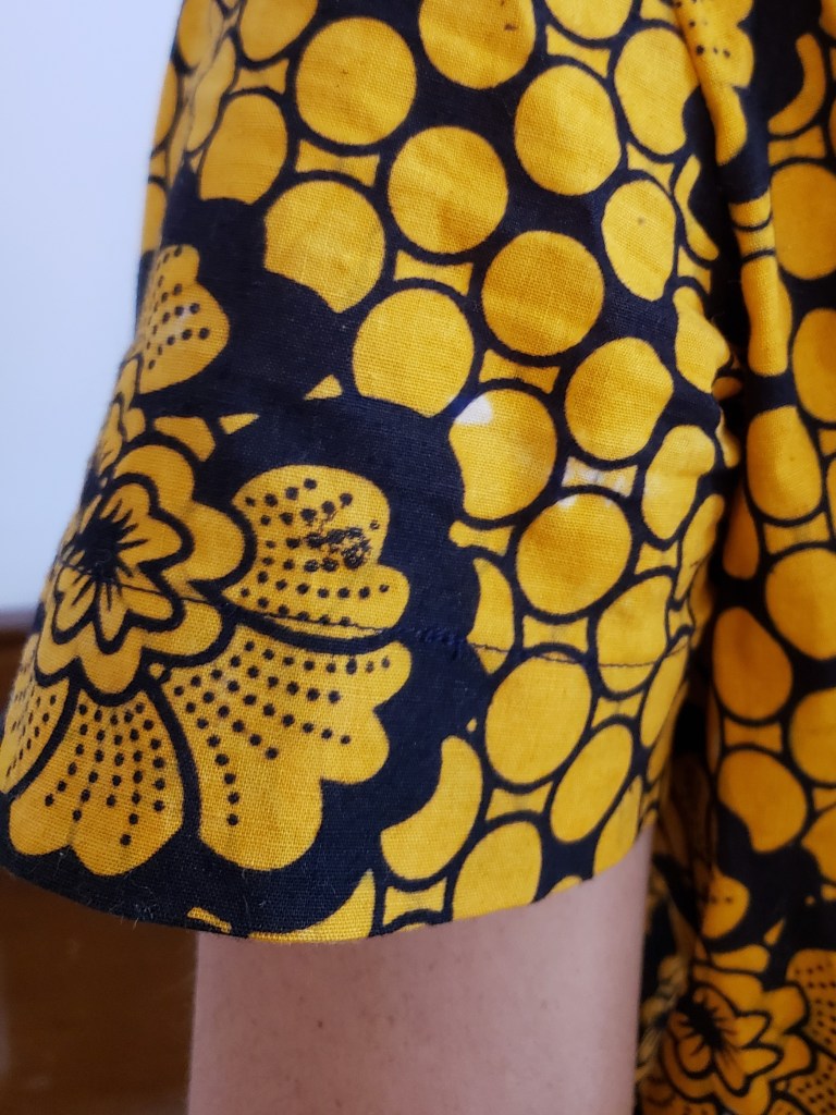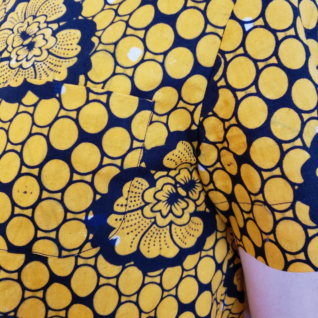- J’ai rapetissé légèrement la poche (moins haute, même largeur) pour me permettre d’utiliser mes restes de tissu tout en alignant les motifs avec la pièce de devant. Ce n’est pas exact, mais je n’ai pas réussi à déterminer si c’est parce que le tissu a été imprimé à la main (et donc la répétition du motif n’est pas 100% régulière) ou si je n’ai simplement pas compris comment le motif se répète.