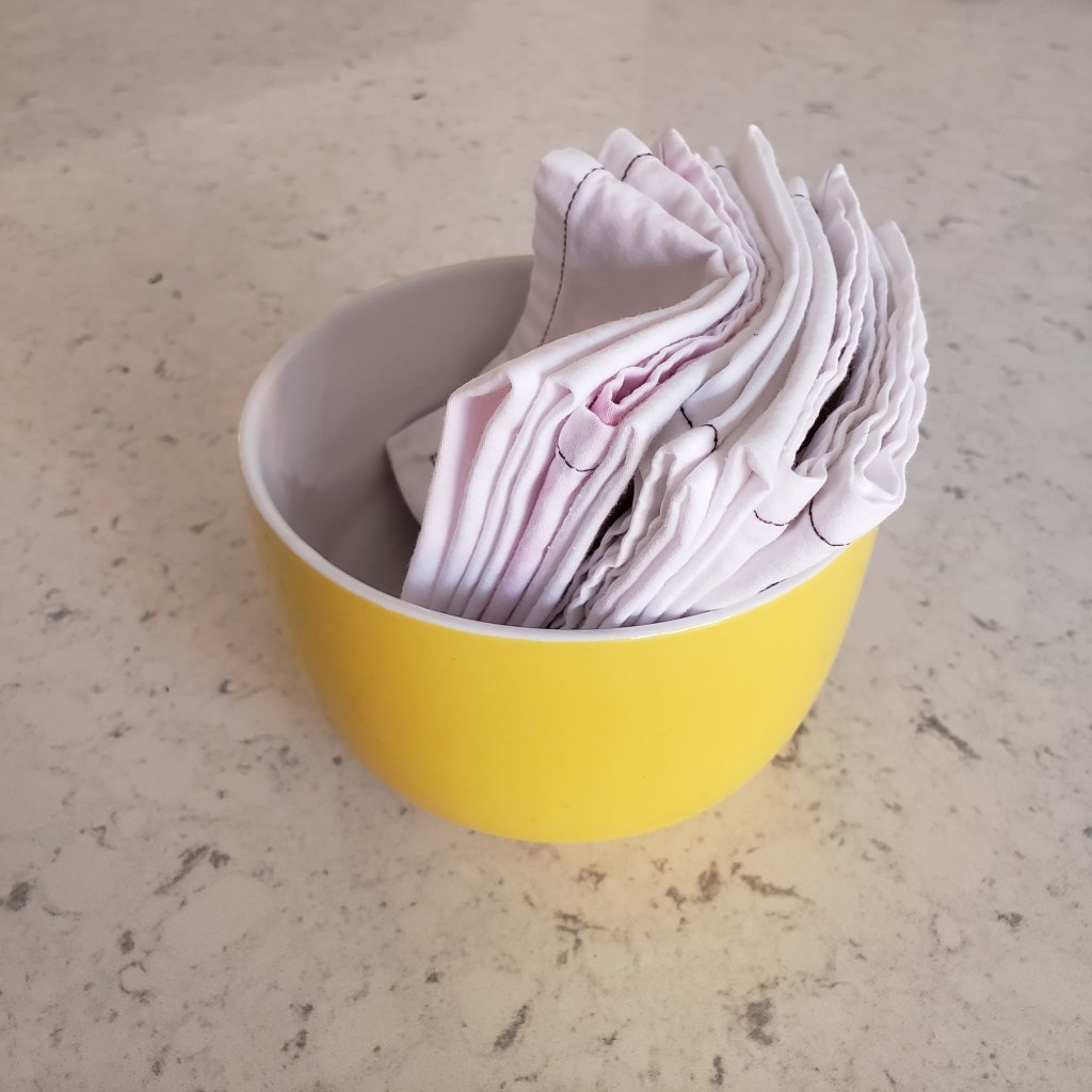 Faire des mouchoirs demande moins de tissu que je ne l’aurais imaginé, donc comme on dit en bon québécois: ne partez pas en peur. Une taie d’oreiller donne environ 12 mouchoirs. Ne commencez pas par tailler un drap pour ensuite vous retrouver avec une quantité écrasante de découpage ou de couture à faire. Vous en serez dégoûtés et pas plus avancés.