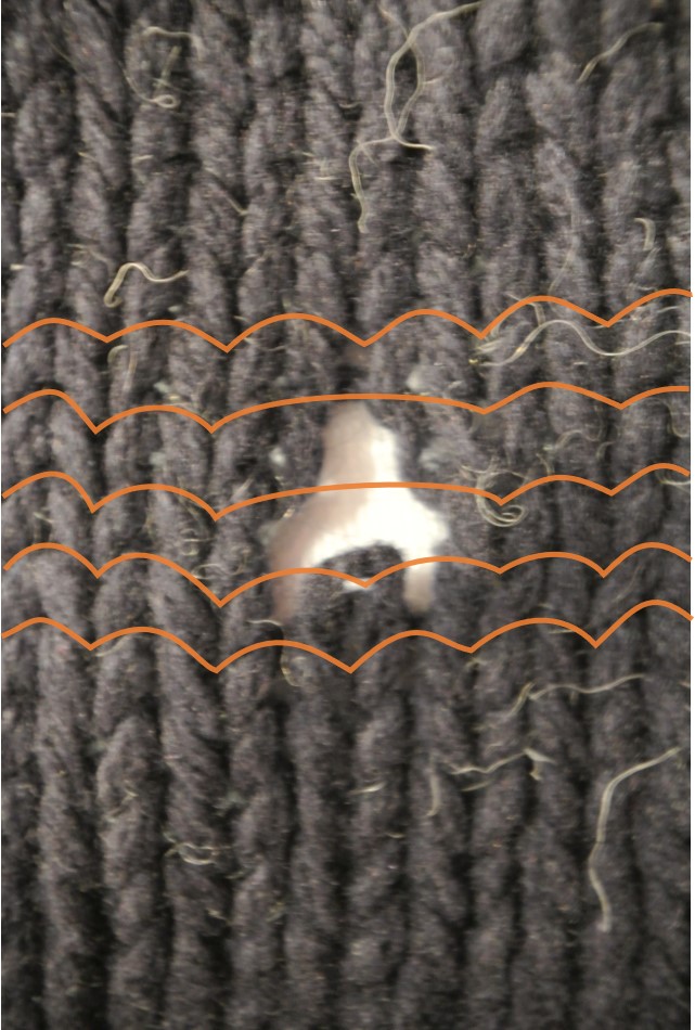 La clé de cet exercice de renforcement est de copier les entremêlements de la laine au mieux. La plupart des tutoriels que j’ai lus proposent une recette: pique en haut, pique en bas, à gauche, à droite. Pour ma part, j’ai trouvé qu’il est plus utile de se laisser guider par le tricot devant moi, surtout quand je renforce des endroits qui ne sont pas des surfaces planes.