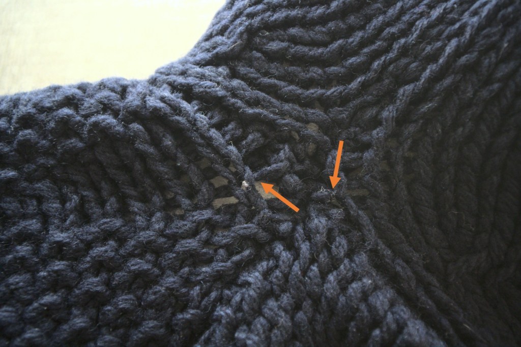 Si on se pose la question… c’est probablement y répondre. Quelques mois avant que cette fameuse maille rompe, j’avais essayé de prendre en photo les coudes « avant » pour illustrer ce blog. Mais les photos avaient l’air parfaites! Je me suis donc dit qu’il n’était pas nécessaire de réparer. Erreur: nous voici quelques mois plus tard et un trou est apparu. Si les mailles semblent un peu relâchées ou que la fibre est amincie (voir les flèches ci-dessous), c’est le moment de renforcer.