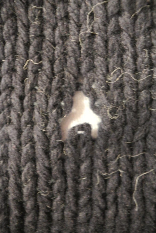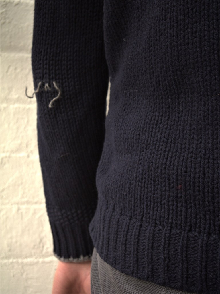 Notre mission est de renforcer un chandail de laine de façon invisible (à la demande expresse de Monsieur). Comme une seule maille est brisée, pas besoin de s’embarquer dans une grande réparation complexe, on se concentrera sur le renforcement. Je vous conseille d’inspecter le vêtement pour trouver les autres endroits qui ont besoin d’être renforcés. Ils auront en général l’air étrangement élastiques et transparents. L’usure devrait être à peu près symétrique, s’il y a usure d’un côté, il y a fort à parier que l’autre côté est aussi usé. Dans mon cas les aisselles avaient aussi besoin d’un renforcement, mais pour vous ce sera peut-être le bout des manches, le col… Tout le monde est différent!