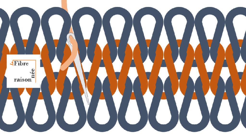Commençons par un cas simple: si on renforce un point jersey (on discutera d’un autre cas plus bas), on se rend compte se la remarquable simplicité d’un tricot: des rangées de boucles entremêlées. En suivant les fibres, on pourra répliquer les petites boucles une à une. On ne fait que suivre le rang sur lequel on travaille, en tentant au mieux de passer entre les mailles et de ne pas piquer dans la fibre. Évidemment, vous risquez de ne pas avoir de beaux rangs de couleurs différentes (comme dans le gif ci-dessous) sur le tricot que vous réparez, il faut donc porter un peu attention pour toujours rester sur le bon rang.