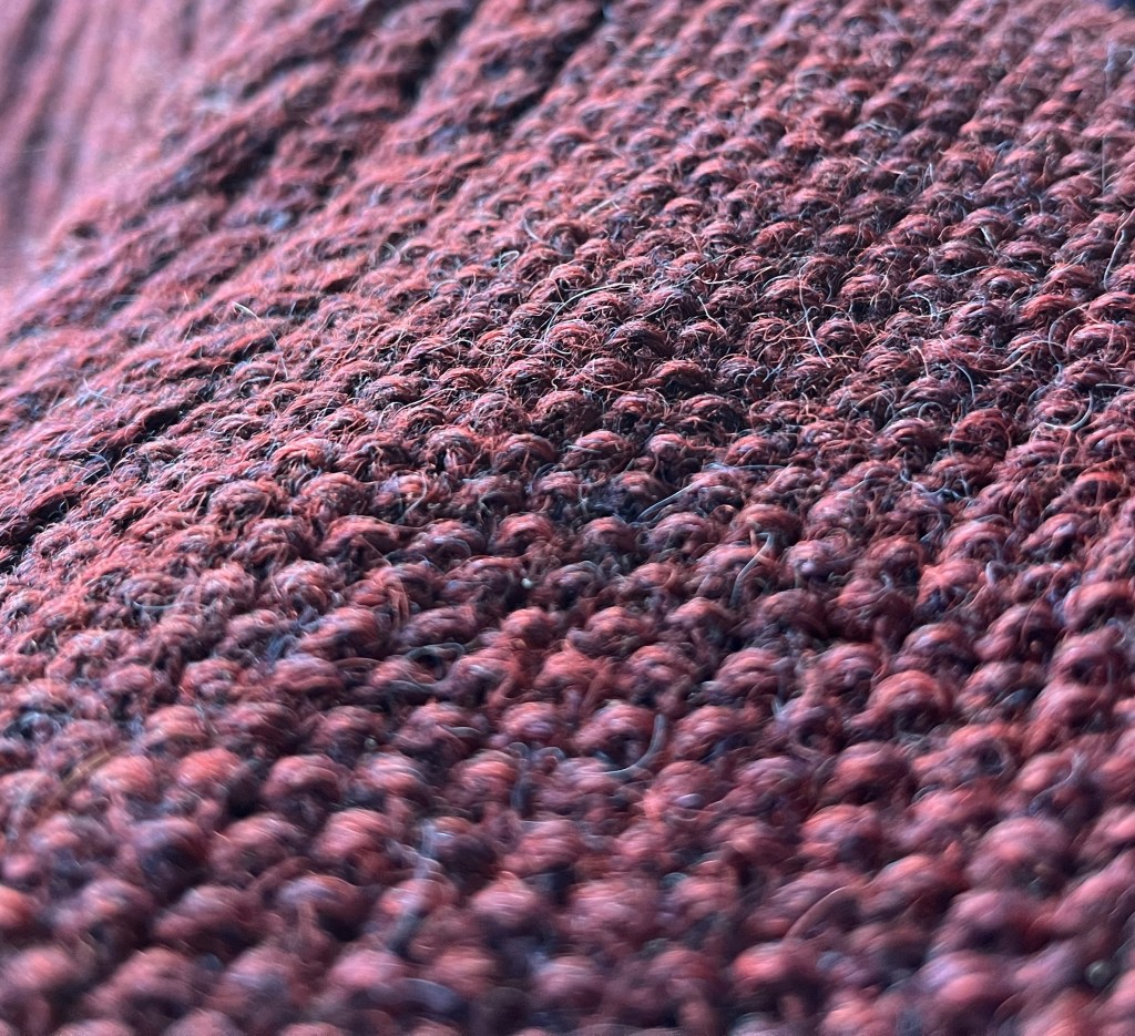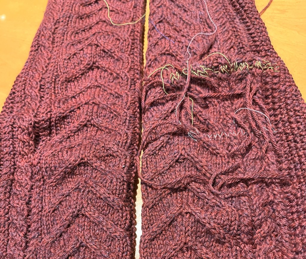 Je vous ai parlé de renforcer (ou repriser ou remailler) un chandail de laine et je vous ai exposé ma technique dans cet article – l’un des articles les plus lus de ce blogue. J’ai utilisé cette technique pour réparer le chandail qui sert d’exemple une bonne douzaine de fois, en plus de la fois où j’ai complètement refait le bas y compris les côtes. Cependant, j’ai senti le besoin de détailler la technique pour des motifs plus complexes. Pourquoi? J’ai eu besoin de renforcer des câbles ou torsades, du point de riz et d’autres motifs et je n’ai pas trouvé de ressource utile pour m’aider. En anglais, en français, en utilisant différents moteurs de recherche, réseaux sociaux… Peut-être fallait-il chercher en allemand? Considérez cet article comme une extension, comme un défi supplémentaire une fois la technique de base maîtrisée. Pour rappel, le lien vers l’article original: