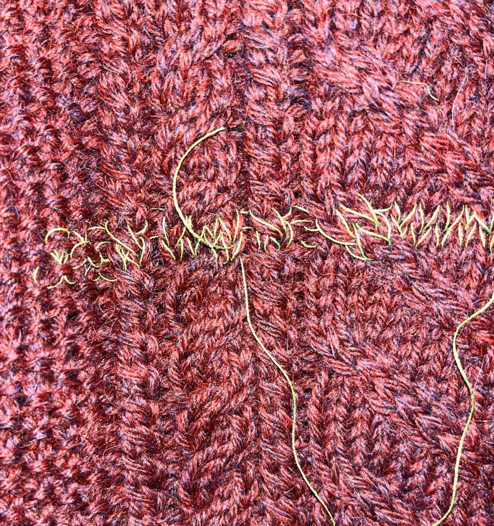 Ensuite, pas de magie, on tente au mieux de suivre le cours de la laine en suivant le motif comme je le montrais dans mon article original et on le suit pour un seul rang jusqu’à avoir atteint la largeur cible de notre zone de réparation. Si vous avez tricoté vous-même le chandail et que vous avez encore le patron, ça peut être un outil très aidant. Une fois le rang en fil à coudre complété, il vaut la peine de décoller le nez de son ouvrage pour voir si tout semble droit – il est fort possible que non, auquel cas vaut mieux retenter tout de suite que de repousser le problème à plus tard, à moins d’avoir déjà essayé à plusieurs reprises.