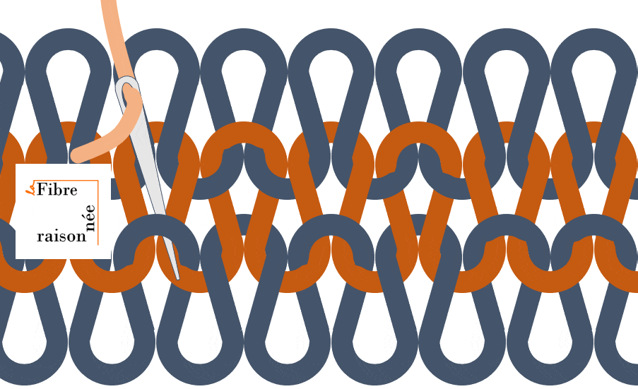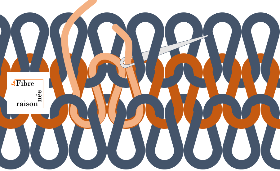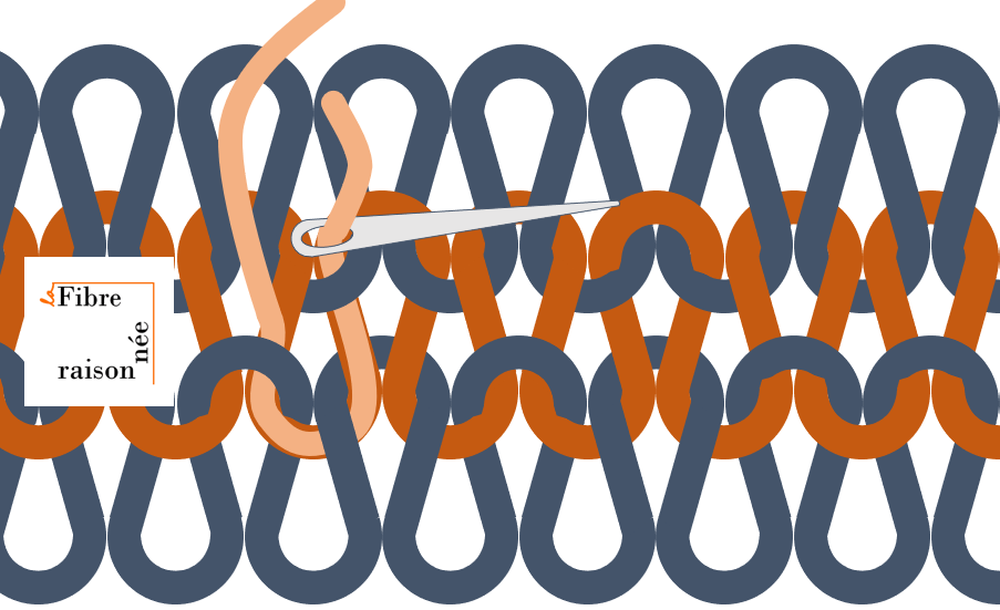 Une fois le premier rang terminé et validé, on en démarre un nouveau, si possible avec une autre couleur de fil contrastant. Pourquoi une autre couleur? Car je me suis trompée de nombreuses fois en faisant le premier rang et j’ai trouvé que la différence de couleur aide à s’y retrouver. Évidemment c’était pour le deuxième coude que je n’ai pas photographié… On peut considérer la deuxième couleur comme un test. Si on suit la laine, en s’aidant de notre rang de fil à coudre (bien sûr), et qu’on ne trouve aucune erreur, que tout est droit, c’est probablement parce que tout est bien fait! Et si ça vous arrive du premier coup: wow! Vous avez trouvé de petites coquilles comme moi ? Normal! Il vaut la peine de prendre le temps de les corriger. Ensuite, il est temps de passer à une prochaine couleur et de reprendre le processus pour une ligne supplémentaire pour s’assurer que tout est en ordre avant de commencer la réparation.